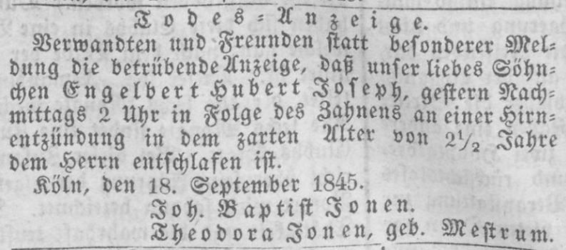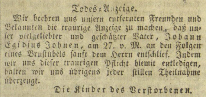 vielgeliebter und geschätzter Vater Johann Egidius Johnen am 27. d. M., an