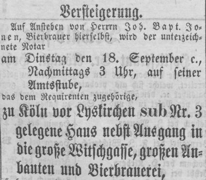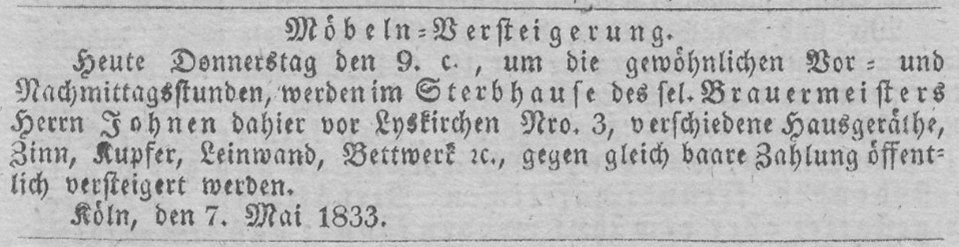 gleich baare Zahlung öffentlich versteigert werden. Köln, den 7. Mai 1833…“