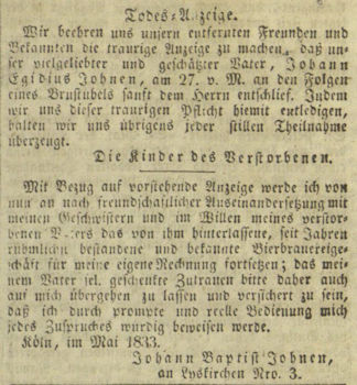 Mai 1833. Johann Baptist Johnen, an Lyskirchen Nro. 3…“