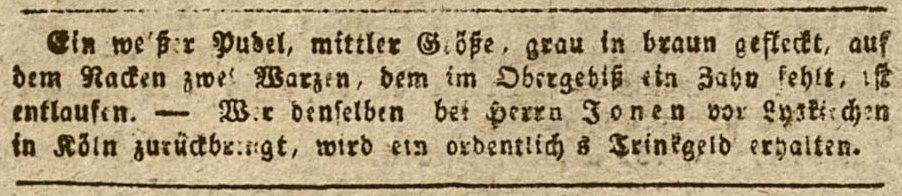 Suchanzeige aus dem Jahr 1816, in der ein Entlaufener Pudel mit Zahnlücke
