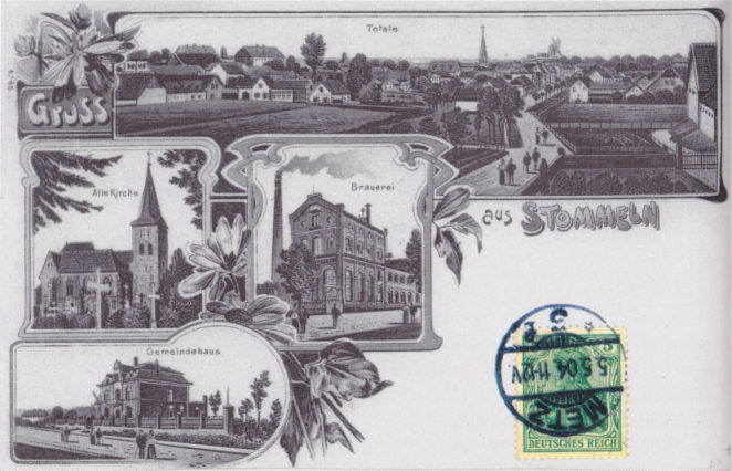 Postkarte "Gruß aus Stommeln". In der Mitte ist die Brauerei abgebildet