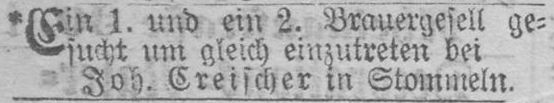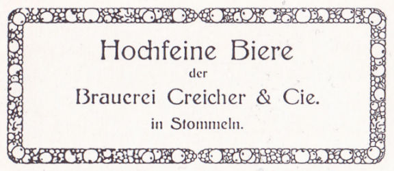 [5]: „… In das hiesige Handels- (Firmen-) Register ist heute unter Nr. 5918 eingetragen worden der zu Stommeln wohnende Bierbrauer Johann Franz Creischer, welcher daselbst feine Handelsniederlassung hat, als Inhaber der Firma: "J. Creischer". Köln, 13. Juni 1892 …“.