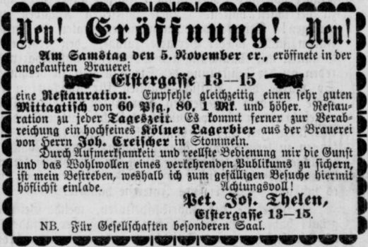 sowie Mälzereien. Weiter besaß Peter Josef Thelen noch mehre Hotels in Köln und Umgebung (Josefine wird im Handelsregister auch als „Hotelbesitzerin in Cöln“ aufgeführt).