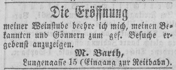 Anzeige von Michael Barth zur Eröffnung seiner Weinstube in der Lungengasse