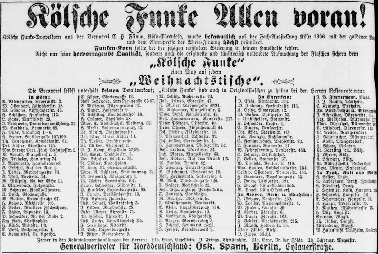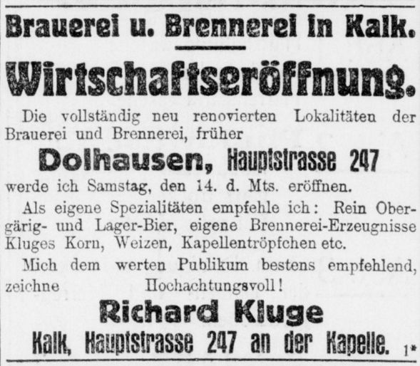 Der erste bekannte Nachweis der Brauerei auf der Hauptstraße 199 in Kalk. Im