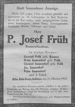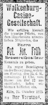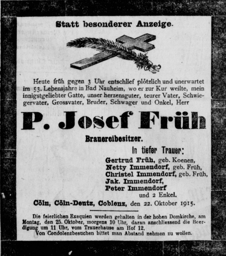 wird als Wohnsitz Köln-Müngersdorf angegeben. Der Eintrag „Früh Peter Josef,