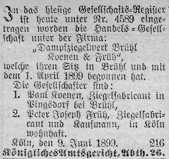 Firma „Dampfziegelwerk Brühl Koenen& Früh“, welche ihren Sitz in Brühl und