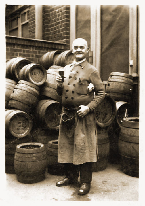 Links neben dem Fass ist Ludwig Baller abgebildet