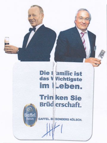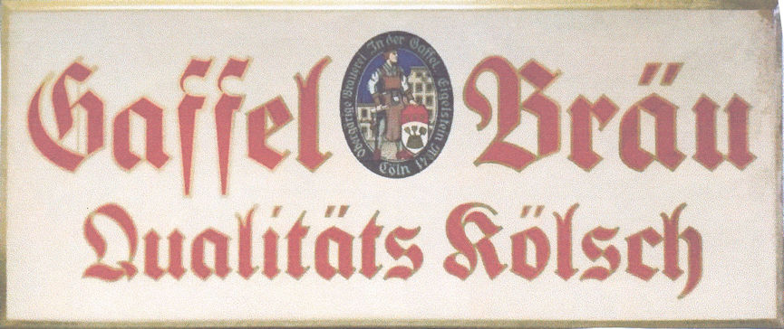 sind Werbeschilder von "Gaffel-Bräu Qualitäts-Kölsch" und "Sünner Kristall"