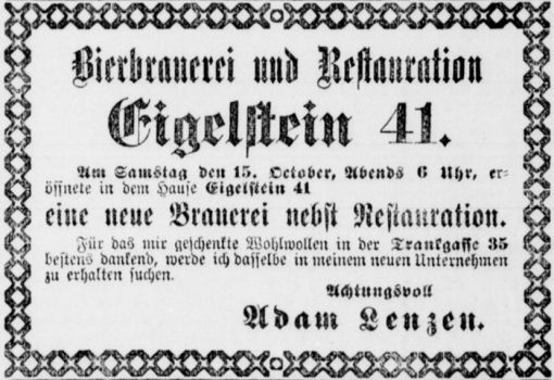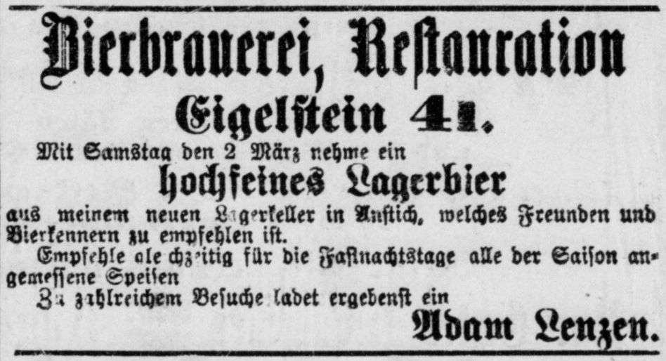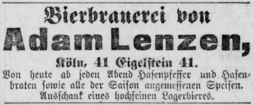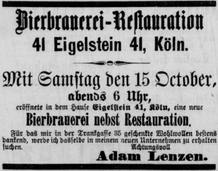 Anzeige zur Eröffnung der Brauerei am Eigelstein 41 durch Adam Lenzen aus