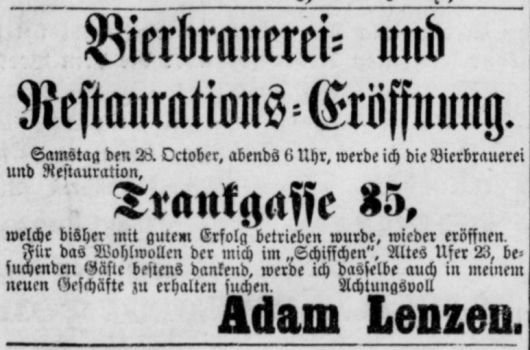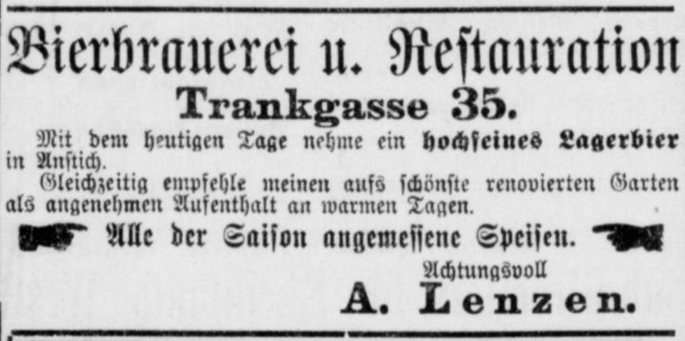 Werbung der Brauerei in der Trankgasse 35 aus dem Jahr 1884
