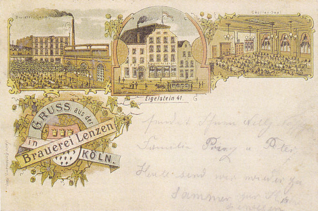 Postkarte der Brauerei von Adam Lenzen am Eigelstein 41 aus dem Jahr 1898.