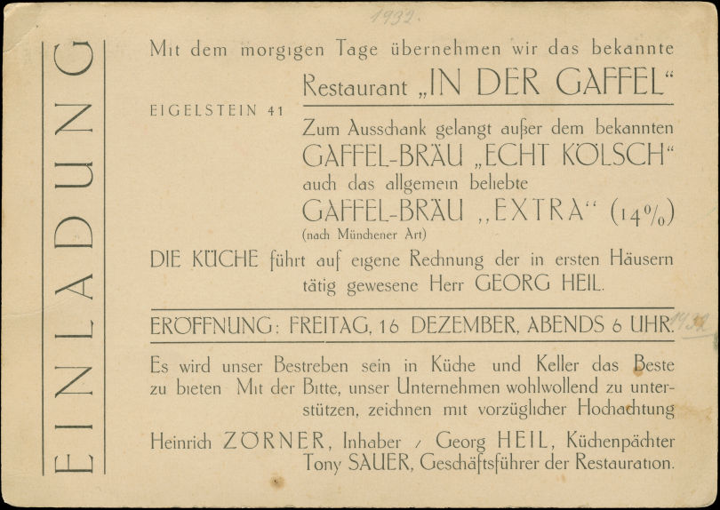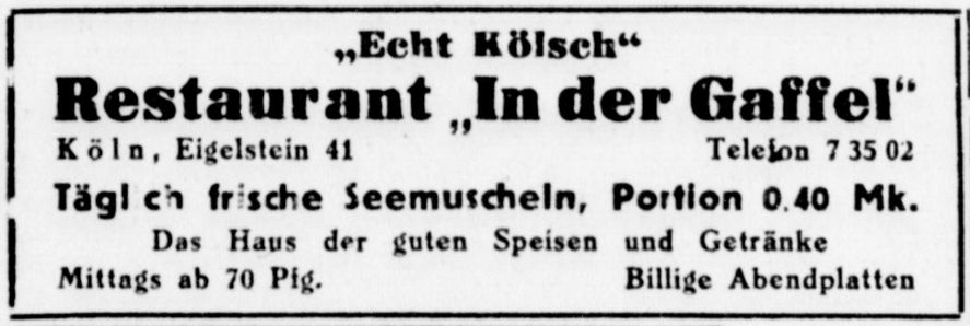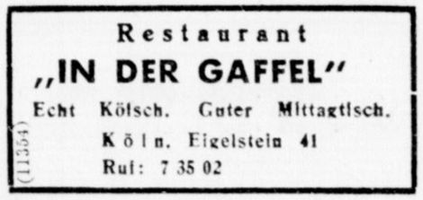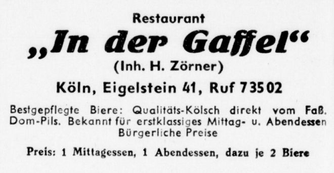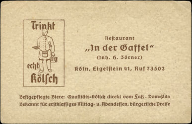 "In der Gaffel" - Köln a. Rh. Eigelstein 41 - Telefon: 73502