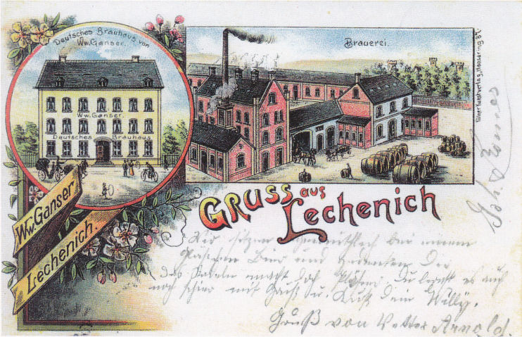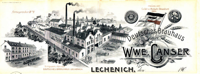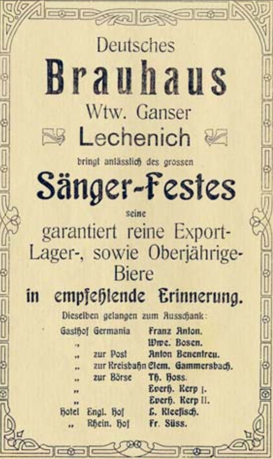 Werbung des Deutschen Brauhauses Wtw. Ganser aus Lechenich, um 1900
