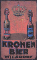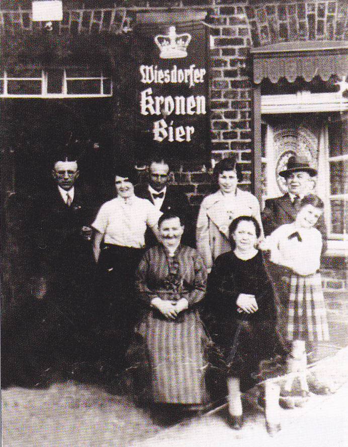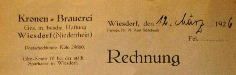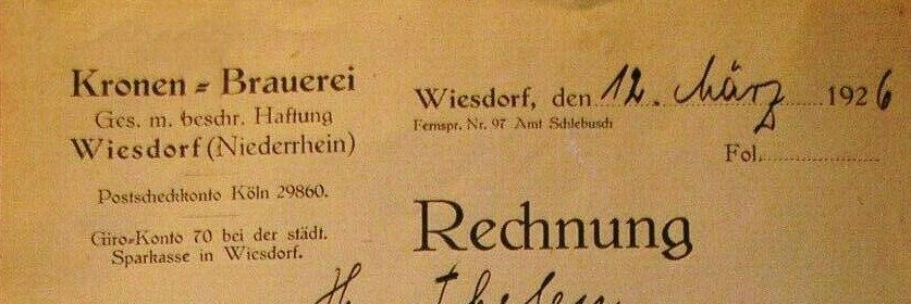 1920 mit einem Werbeschild für "Wiesdorfer Kronen Bier"