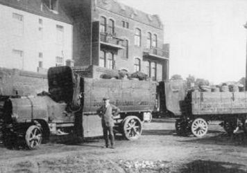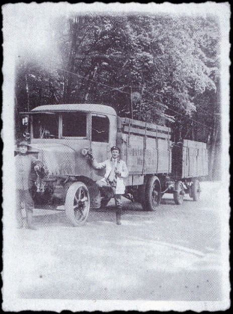 Das Foto ist aus dem Jahr 1923, vor dem Lastwagen ist der Gründer Oswald