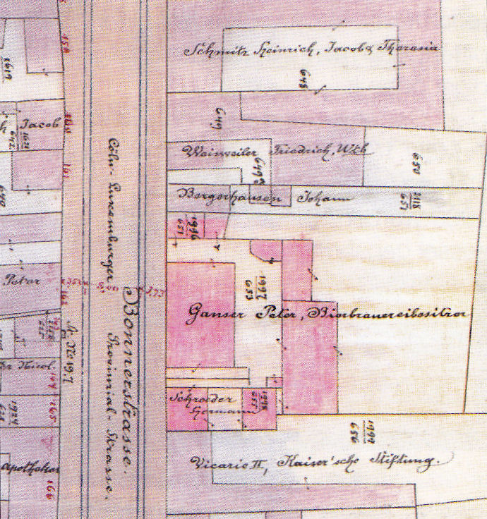 Gasthaus und Brauerei befanden sich in einem bereits bestehenden Gebäude in der Bonner Str. 9-11. Das dreigeschossige, siebenachsige Backsteingebäude im klassizistischen Stil ist heute noch erhalten und als „Haus Ganser“ bekannt. Es wurde im Jahr 1817 durch den jüdischen Händler und Immobilienmakler Jacob Cahen erbaut und diente zeitweise dem Landrat des Kreises Lechenich als Wohnsitz. Die Jahreszahl „1817“ ist heute noch in den Ankerzahlen am Giebel erkennbar.