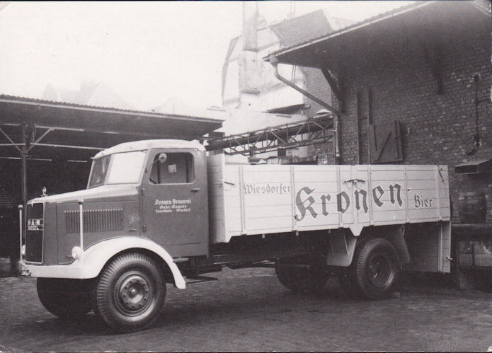 LKW des Deutschen Brauhauses Lechenich vor der Kronen-Brauerei in Wiesdorf.