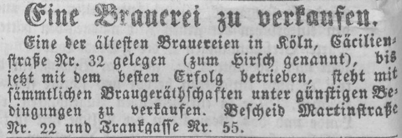 Die Brauerei "Im Hirsch" war eine der ältesten Brauerei Kölns