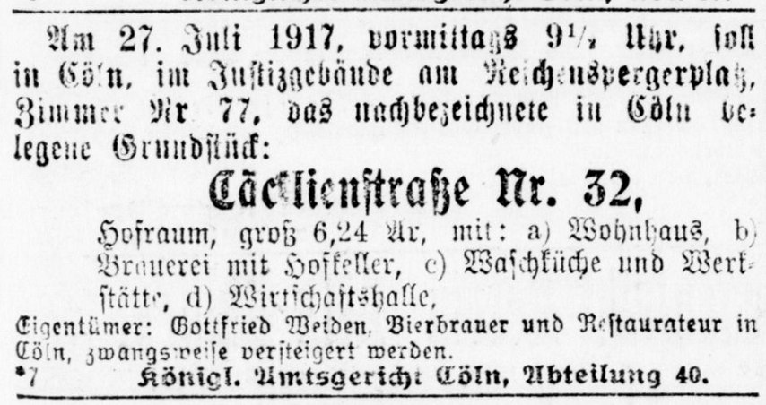 im Branchenverzeichnis als Brauer in der Cäcilienstraße 32 aufgeführt wird.