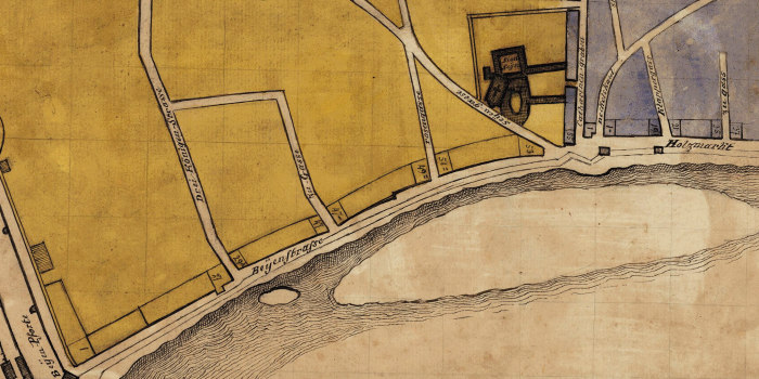 Karte von Köln aus dem Jahr 1797. Rot markiert ist die Lage der Brauerei