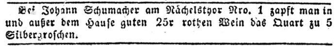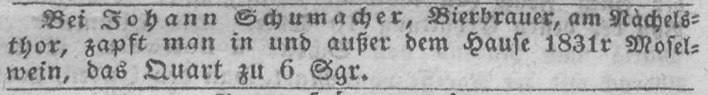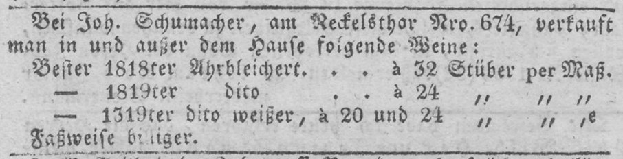 Weinverkauf bei Brauer Johann Schumacher. Besten 1818ter Ahrbleichert für 32 Stüber das Maß (ca. 1,78 Liter). Anzeige aus dem Jahr 1820