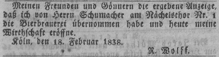 übernommen habe und heute meine Wirthschaft eröffne. Köln, den 18. Februar