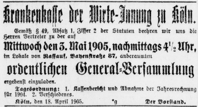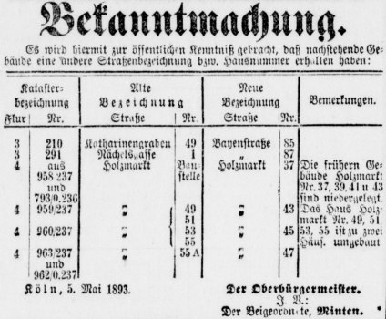 eine Umbenennung von Straßen und / oder Neunummerierung der Straßen. Weiter unten abgebildet ist eine Bekanntmachung auf dem Kölner Lokal-Anzeiger vom 7. Mai 1893. Dieser Bekanntmachung ist zu entnehmen, dass im Mai 1893 die Straße Nächelsgasse 1 in Bayenstraße 87 umbenannt wurde.