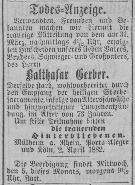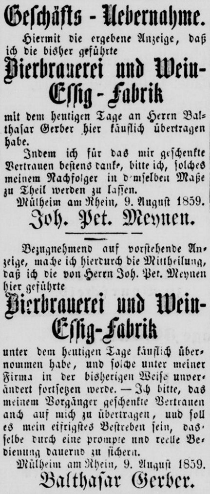 [2, 12.08.1859] „…Bezugnehmen auf die vorstehende Anzeige, mache ich hierdurch die Mittheilung, daß ich die von Herrn Joh. Pet. Meynen hier geführte Bierbrauerei u. Weinessig-Fabrik unter dem heutigen Tage käuflich übernommen habe, und solche unter meiner Firma in der bisherigen Weise unverändert fortsetzen werden. Ich bitte, das meinem Vorgänger geschenkte Vertrauen auch auf mich zu übertragen, und soll es mein eifrigstes Bestreben sein, dasselbe durch eine prompte und reelle Bedienung dauernd zu sichern. Mülheim am Rhein, den 9. August 1859. Balthasar Gerber…“