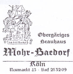 Werbung für das Obergärige Brauhaus Mohr-Baedorf, Inhaber ist Fritz Baarhaf.