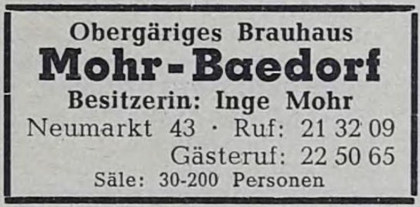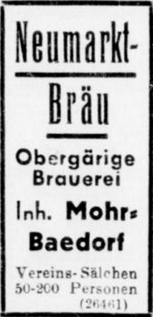 Die folgenden 58 Jahre wurde das Gebäude als Restaurant weitergeführt, bis im Jahr 1931 die Familien Mohr und Baedorf die „Obergärige Bierbrauerei Neumarkt-Bräu, Mohr-Baedorf“ gründeten. Bereit ein Jahr später, im Jahr 1932, gab es bereits die erste Umfirmierung. Der Name „Baedorf“ verschwand aus der Firmierung, die fortan „Obergärige Bierbrauerei Neumarkt-Bräu, Willi Mohr“ lautete. Die Brauerei florierte, nicht zuletzt wegen der guten Lage am Kölner Neumarkt. Produziert wurde ausschließlich obergäriges Bier.