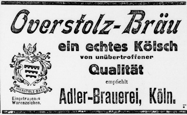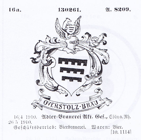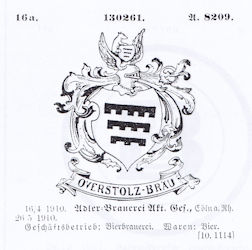 Warenzeichen "OVERSTOLZ-BRÄU" aus dem Jahr 1910, eingetragen von der Adler-Brauerei Akt. Ges.