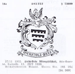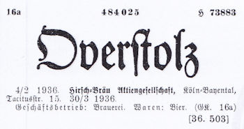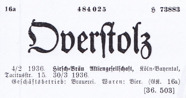 Warenzeichen "OVERSTOLZ-BRÄU" aus dem Jahr 1936, eingetragen von der Hirsch-Bräu Aktiengesellschaft.