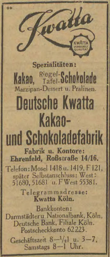 „Kwatta Kakao- und Schokoladenfabrik in Ehrenfeld”. In: KuLaDig, Kultur.Landschaft.Digital. URL: https://www.kuladig.de/Objektansicht/KLD-296868 (Abgerufen: 1. Juni 2020)