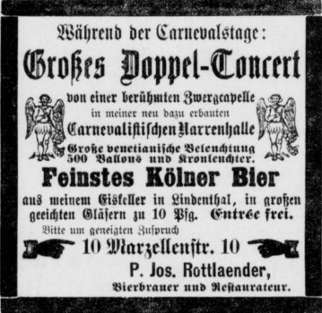 Anzeige der Brauerei in der Marzellenstraße 10 aus dem Jahr 1882. Karneval