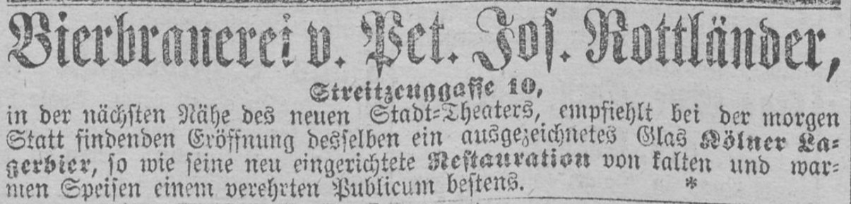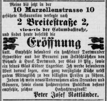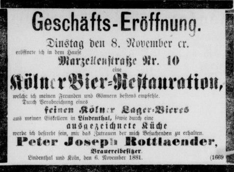Anzeige zur Eröffnung der Brauerei in der Marzellenstraße 10 durch Peter
