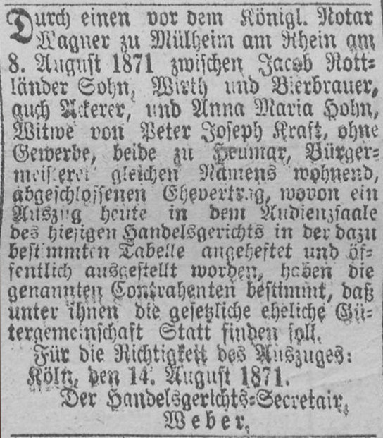 zu. Mülheim am Rhein am 5. August 1871 zwischen Jacob Rottländer Sohn, Wirth