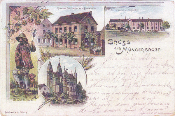 Postkarte "Gruss aus Müngersdorf", vermutlich um 1900. Oben rechts ist die