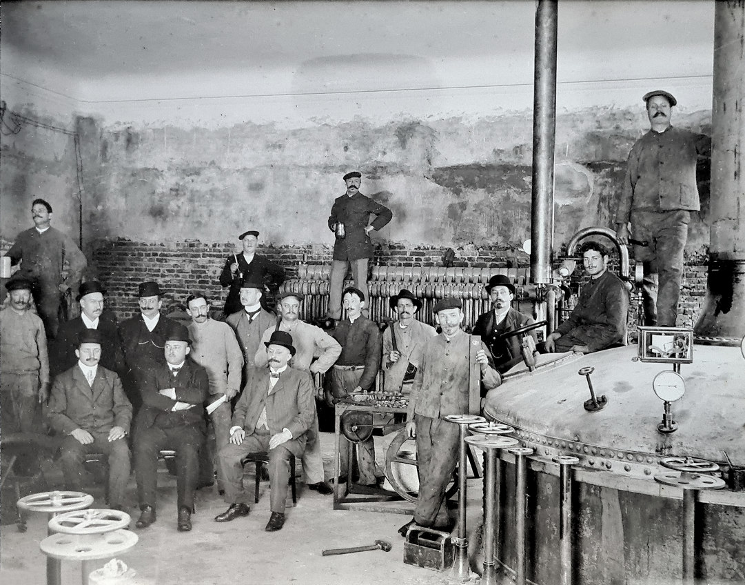 Foto der Belegschaft der Brauerei aus dem Jahr 1912. Außer den 6 "Chefs" mit