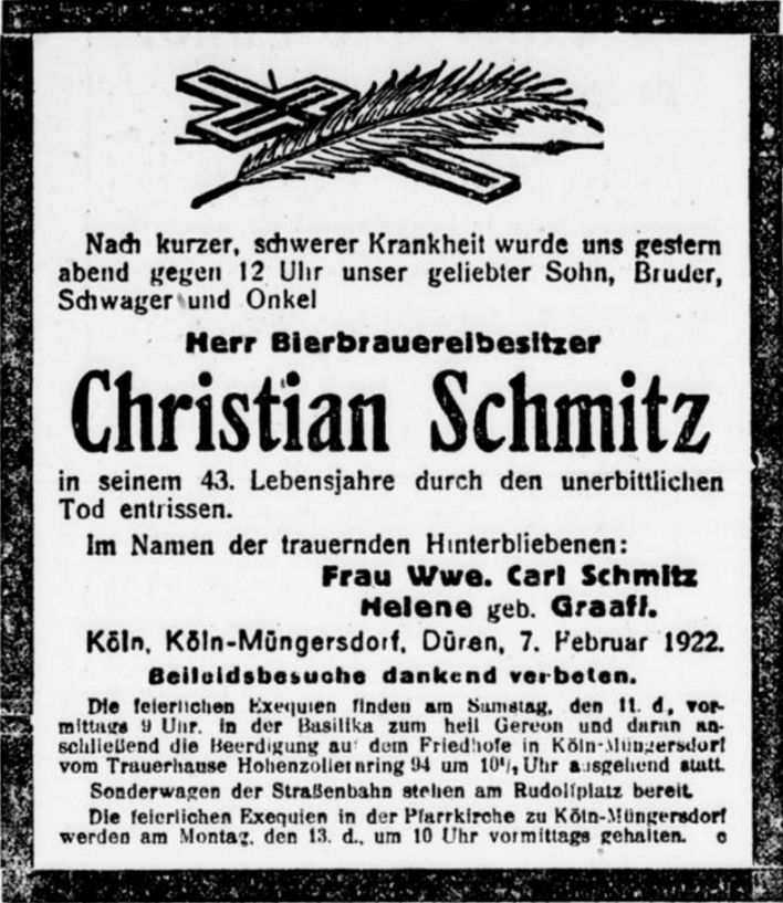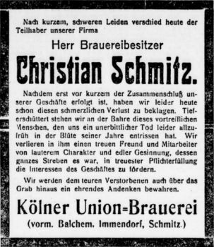 Traueranzeige der Kölner Union-Brauerei zum Tod von Christian Schmitz
