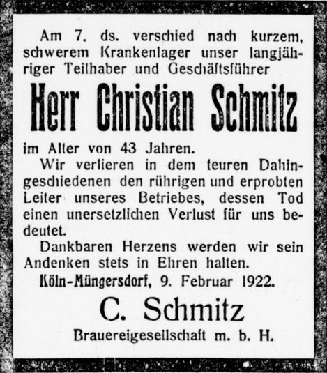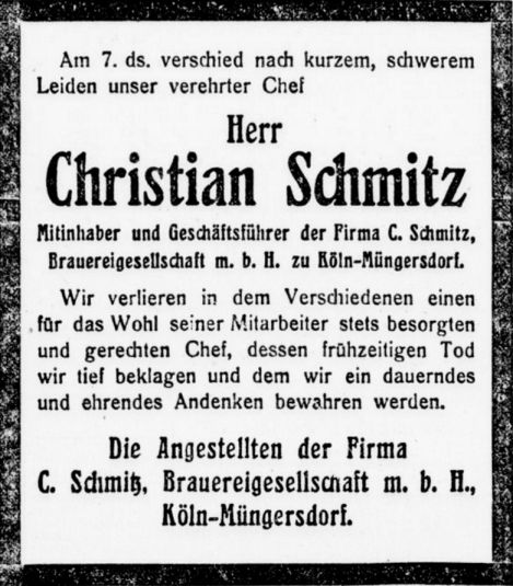 Traueranzeige der Firma C. Schmitz, Brauereigesellschaft m.b.H. zum Tod von