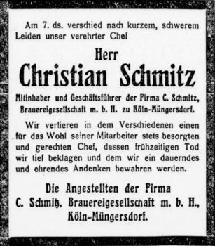 Traueranzeige der Angestellten der Firma C. Schmitz, Brauereigesellschaft