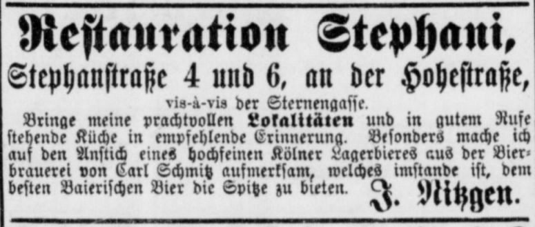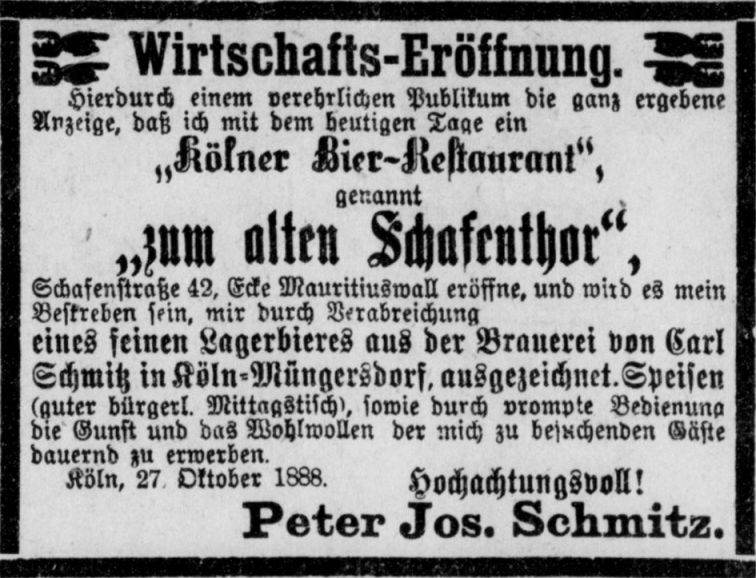Anzeige zur Wirtschaftseröffnung des Kölner Bier-Restaurants von Peter Jos.