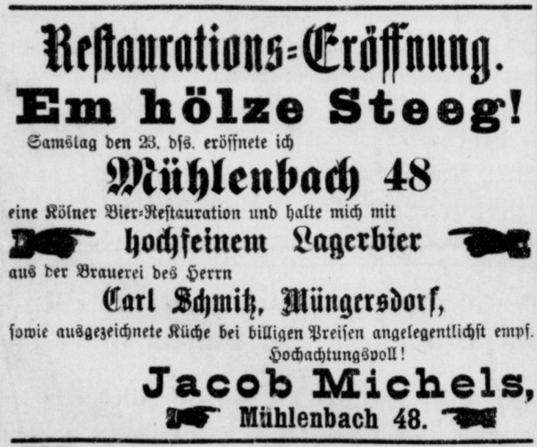 Anzeige zur Eröffnung der Restauration "Em hölze Steeg" aus dem Jahr 1887.