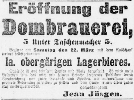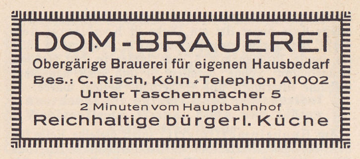 Im "Dombräues", Unter Taschenmacher, zwischen Rathaus und Dom, jetziger Inhaber Brauereibesitzer C. Risch, der die Witwe seines Vorgängers Sion geheiratet hat, ist neues, frisches Leben eingekehrt. Letzterer hatte das im Laufe des vorherigen Jahrhunderts entstandene Brauhaus nach mehrfachem Wechsel von dem früheren Inhaber Vetten übernommen. Vor diesem hatte lange Jahre der bekannte Brauer Jüsgen, ein Bruder des Inhabers der Neumarktbrauerei, Ecke Thieboldsgasse (jetzt Restaurant Hamm „Zum goldenen Schlüssel), die Brauerei betrieben als Nachfolger des Stadtv. Billstein, der seinerzeit in der „Martinsgaß“ (Friedrich-Wilhelm-Straße) das bekannte Hotel Billstein eröffnet hatte, ehedem ebenfalls ein Brauhaus.