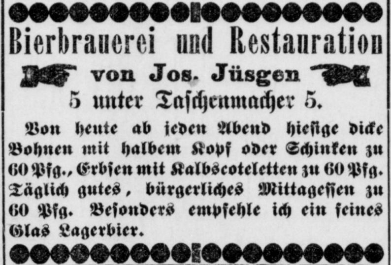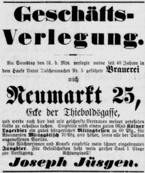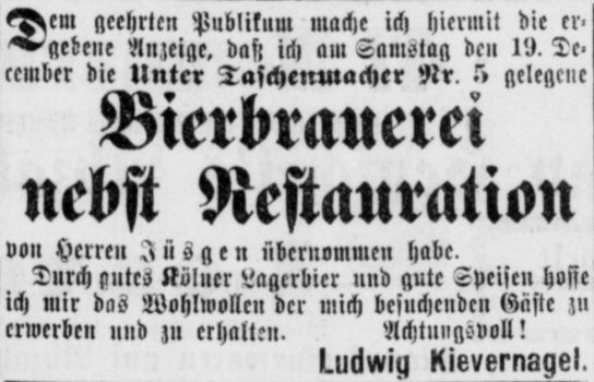 in dem der Brauer Adam Jüsgen das Brauhaus übernahm. Dieser übergab es dann im Jahr 1879 an seinen Sohn Joseph Jüsgen, der es 6 weitere Jahre führte bis dann wiederum im Jahr 1885 Louis Kivernagel die Brauerei übernahm. Joseph Jüsgen führte dann von 1885-1896 teilweise mit seinem Bruder gemeinsam eine Brauerei am Neumarkt 25.