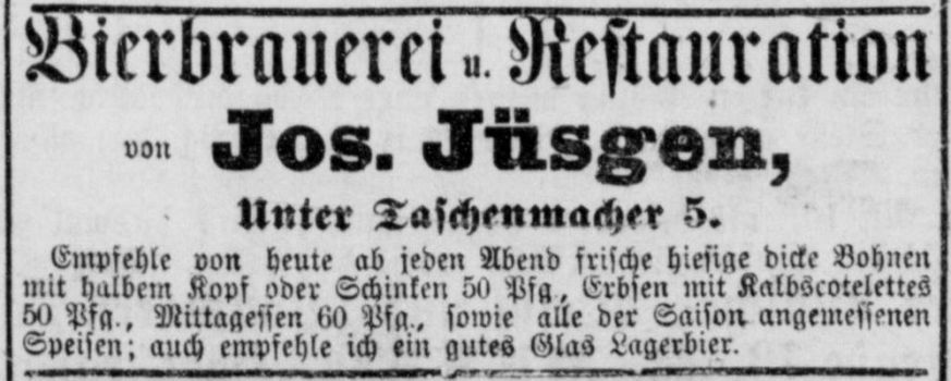 Anzeige von Joseph Jüsgen, der seine Brauerei unter Taschenmacher 5 im Jahr