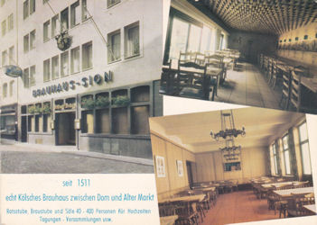Nach dem zweiten Weltkrieg warb die Sion-Brauerei mit dem Slogan „Brauhaus-Tradition seit 1511“, bis man um das Jahr 1995 noch weitere 193 Jahre fand und seitdem mit „Brauhaus-Tradition seit 1318 wirbt. Und das stimmt sogar halbwegs, denn zumindest lässt sich an gleicher Stelle durch einen Eintrag in einem Schreinsbuch (dem Vorläufer der heutigen Grundbücher) von St. Laurenz (einer ehemaligen, im Jahr 1818 abgerissenen katholischen Pfarrkirche in direkter Nähe des Brauhauses) ein Brauer an eben dieser Stelle nachweisen.
