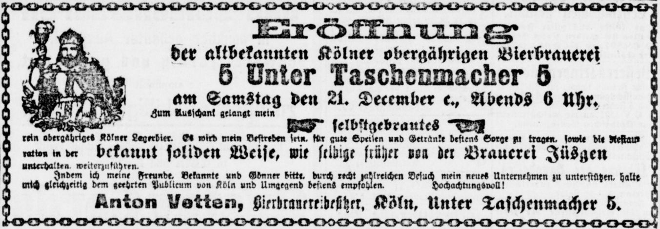 Anzeige von Anton Vetten zur Neueröffnung der Brauerei Unter Taschenmacher 5