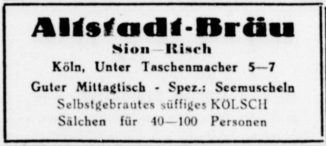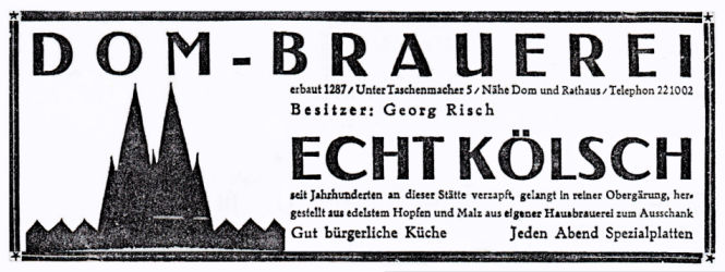 Der jetzige Inhaber Risch, ein tüchtiger Fachmann, der auch eine gute Küche führt, betreibt das im Inneren schmuck und gediegen ausgestattete Bräues im echten alten Kölner Stil und hat damit den Erfolg auf seiner Seite.